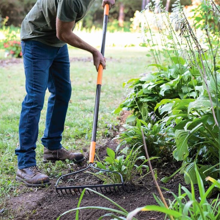 El rastrillo de jardín Fiskars cuenta con púas resistentes y un cabezal remachado que no se cae, lo que lo convierte en un rastrillo que resiste un uso intensivo. Ideal para romper o nivelar la tierra en el jardín, así como para eliminar el pasto muerto del césped, esta herramienta duradera también cuenta con un mango de fibra de vidrio para mayor resistencia y rigidez ideal, así como múltiples posiciones de agarre para mayor comodidad y control. una capa de pintura con recubrimiento en polvo también ayuda a prevenir la oxidación.