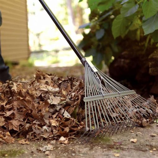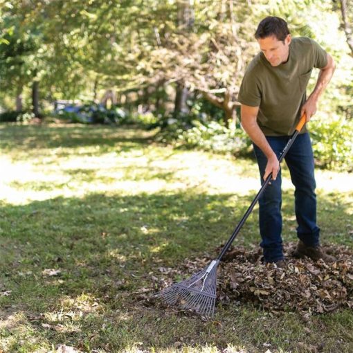 - el rastrillo de hojas de metal y fiskars cuenta con púas metálicas resistentes y un mango de fibra de vidrio resistente y liviano para rastrillar y mover hojas y restos de césped